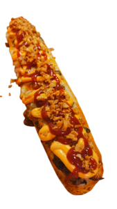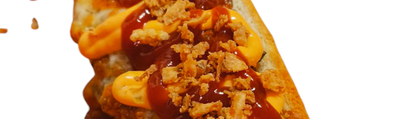Bagietka, duszona cebulka, pieczarki, szynka, sery, sos 1000 wysp, ketchup, prażona cebulka